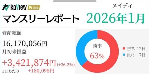 ・資産総額:20,969,581円・月初来損益額:+4,660,451円(+28.8%)・利益寄与上位:KOA(6999)/関電工(1942)/清水建設(1803)・損失寄与上位:純金(現物国内保管型)(1540)/住友金属鉱山(5713)/トーメンデバイス(2737) 【今月の一言】・良... -