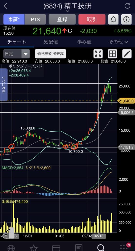 基本的に短期で急激に上がった銘柄は戻しも激しいので、1回目の相場は乗らず、調整後の2回目の上昇相場に乗るのも手だと思っています。