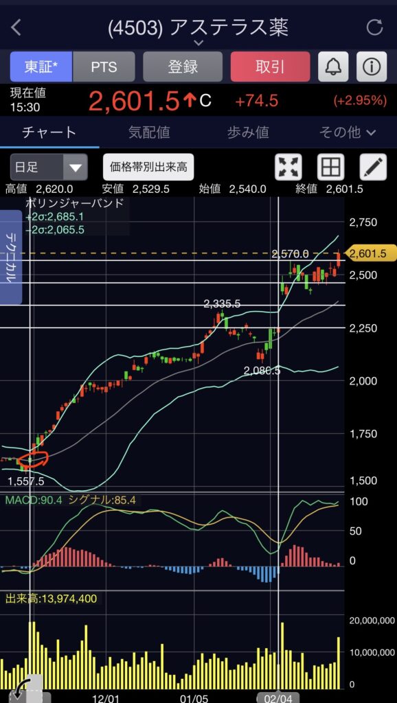 1回目の相場とは、上方修正後に急激に買われ始めて、短期天井をつけるまでの相場を指します。